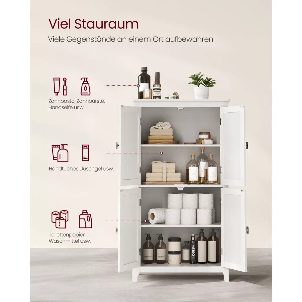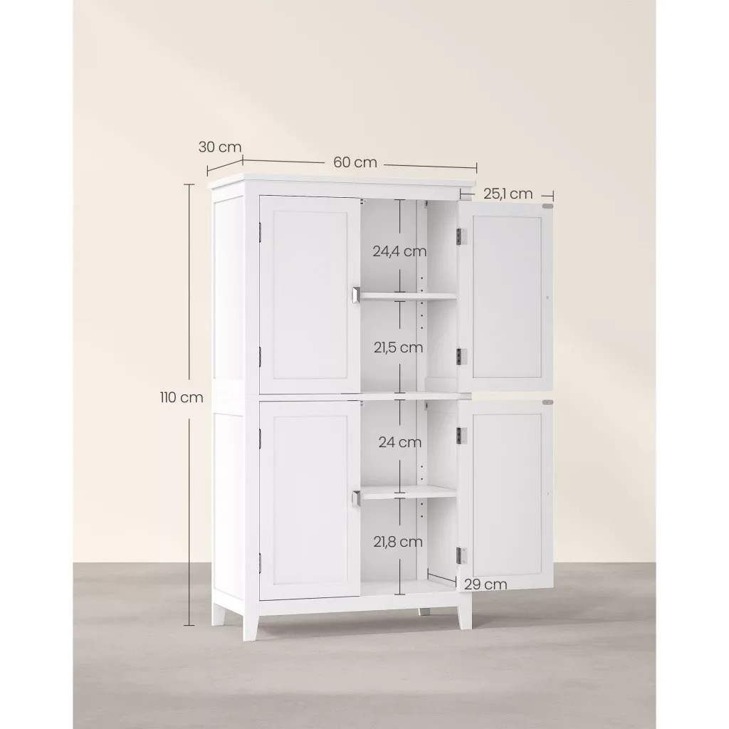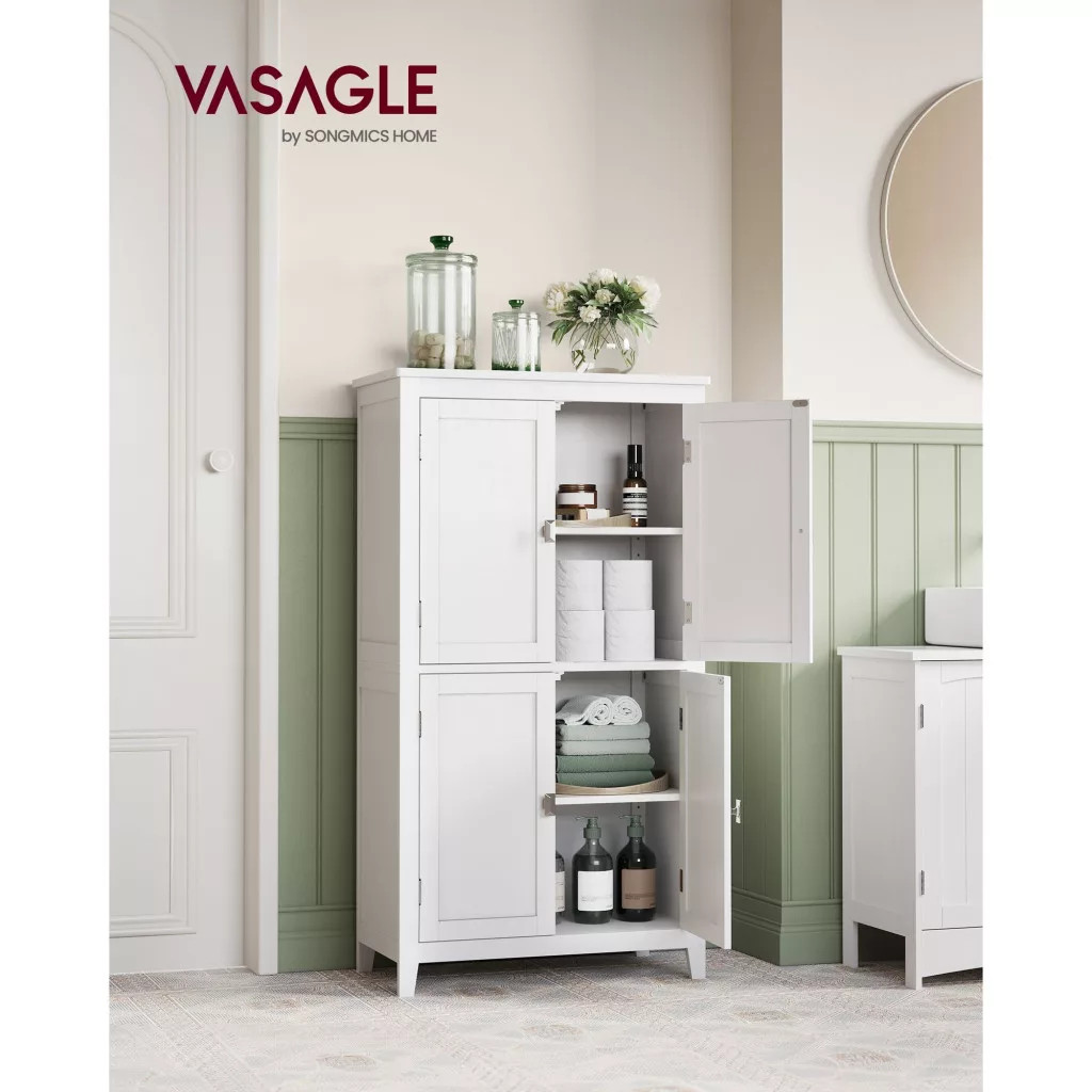 VASAGLE kúpeľňová skrinka, úložná skrinka so štyrmi dvierkami, biela 60x30x110 cm