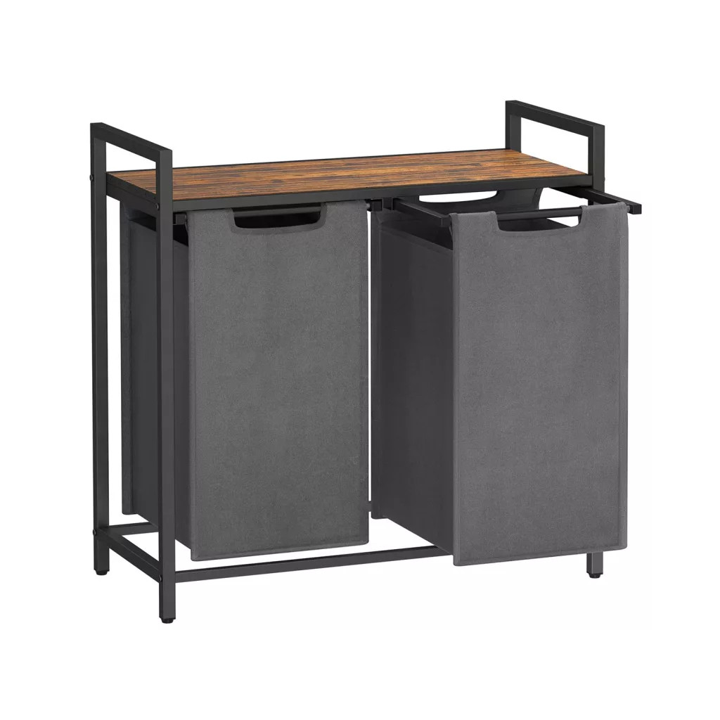 Farba: Rustikálna hnedá, siváMateriál: MDF (drevovláknitá doska so strednou hustotou), oceľ, oxfordská tkaninaRozmery produktu: 73 x 33 x 72 cm (D x Š x V)Rozmery každého vreca: 30 x 30 x 51 cm (D x Š x V)Hmotnosť produktu: 6,1 kgMax. statická nosnosť celkom: 30 kgMax. statická nosnosť na vreco: 5 kgMax. statická nosnosť na policu: 20 kg