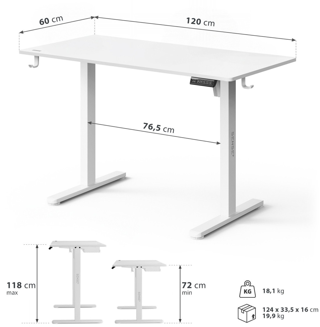 Názov modelu: NOJO LIGHT 120x60 cm Rozmery: Výška: nastaviteľná 72 - 118 cm Šírka: 120 cm Hĺbka: 60 cm Hrúbka dosky stola: 15 mm Hmotnosť: 18,1 kg Maximálne zaťaženie: 70 kg Funkcie a vybavenie: 3 nastavenia výšky 2 držiaky na slúchadlá alebo tašku Rozmery dosky stola: 120 x 60 cm Farba: Biela Materiál: 15 mm MDF (2 prvky) Konštrukcia: Práškovo lakovaná oceľ Farba: Biela Elektromotor na nastavenie výšky: Rýchlosť pohybu: 20 mm/s Napájanie: 220V Hladina hluku: <55 dB Prepravné rozmery: 124 x 33,5 x 16 cm Hrubá hmotnosť: 19,9 kg