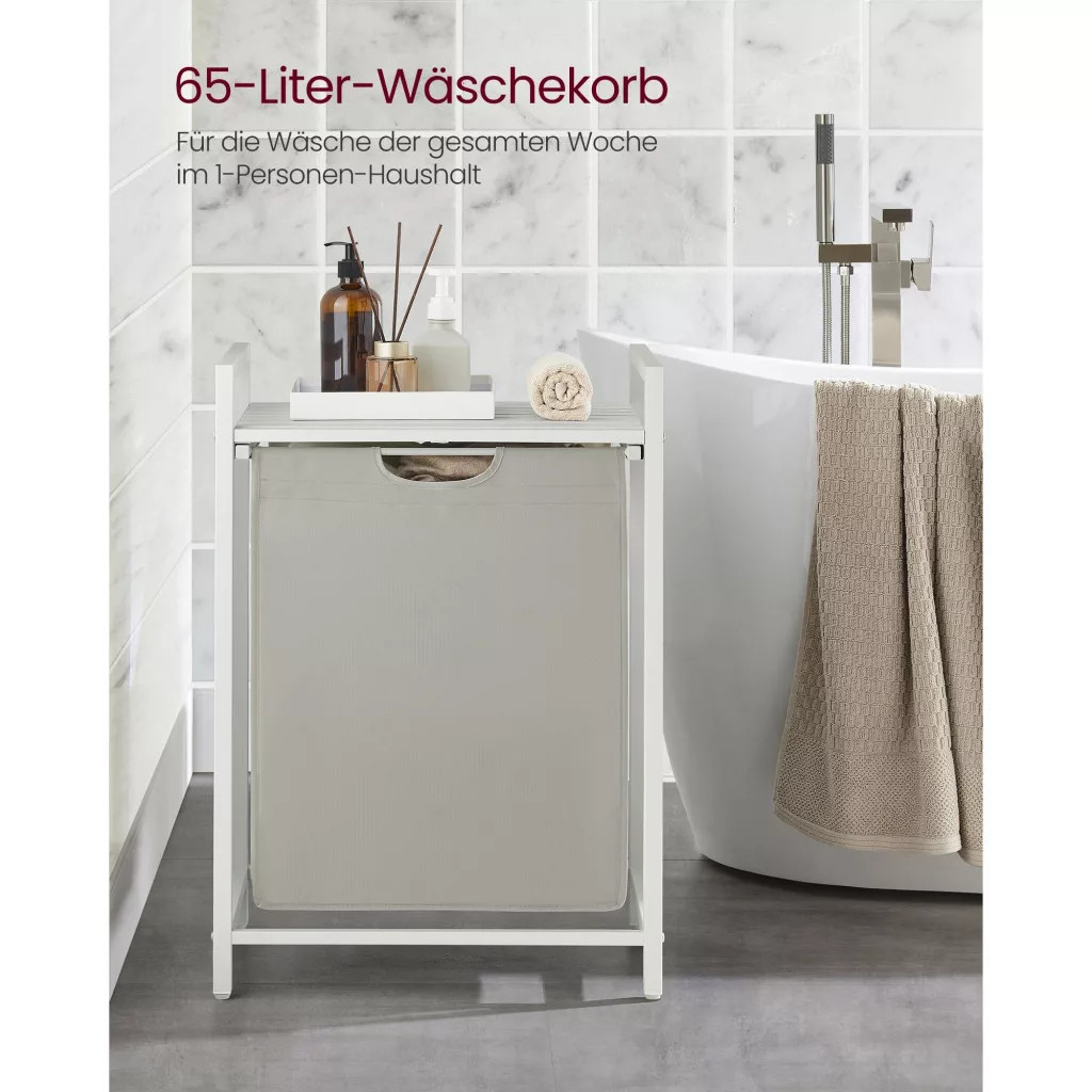 Jeden kôš do malých priestorov: Tento kôš na bielizeň s jedným košom a objemom 65 litrov pojme bielizeň jednej osoby na týždeň. S rozmermi 50 x 33 x 72 cm je tento kompaktný kôš ideálny na maximálne využitie malých priestorov a rohov vo vašej kúpeľni, práčovni alebo spálni.