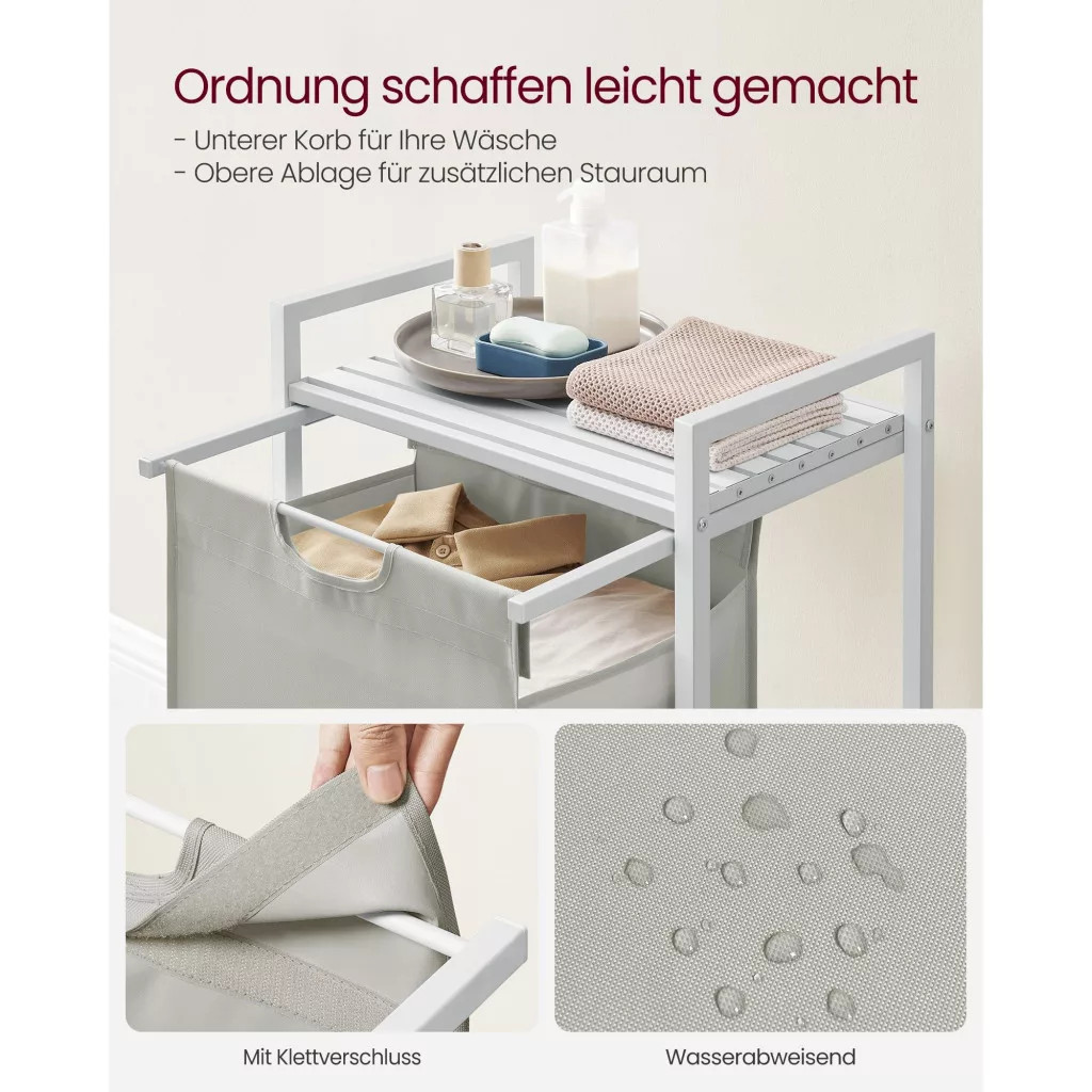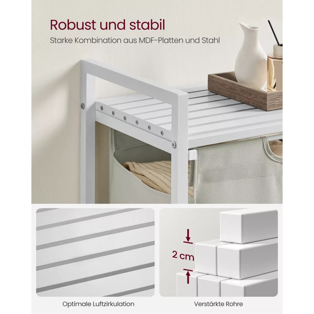 Odolný a stabilný: Tento vešiak na bielizeň je vyrobený z 2 cm oceľového rúrkového rámu a MDF panelu a unesie na hornej polici až 20 kg. Vložka je navyše vyrobená z vodeodolnej oxfordskej látky a štyri nastaviteľné nožičky zaisťujú stabilitu.
