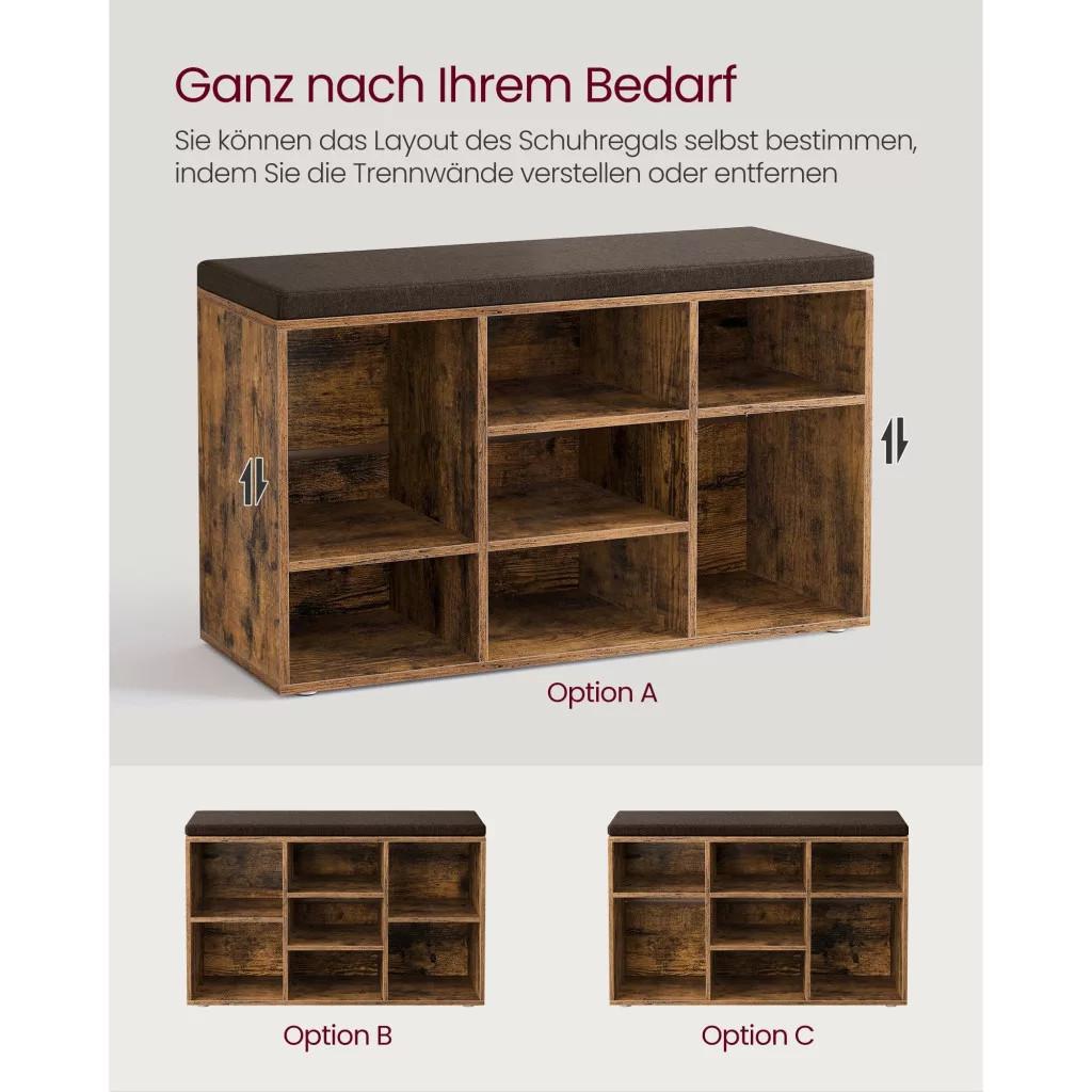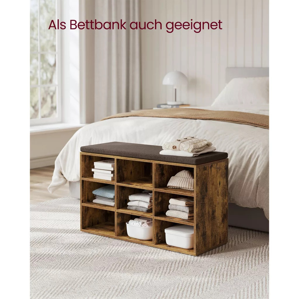 Poriadok v chaose: Skoncujte s neporiadkom vo vašej chodbe s touto lavicou na topánky. Má deväť priehradiek s rozmermi 29,8 x 24,4 cm (H x Š), ktoré ľahko pojmú 9 párov pánskych topánok. Priečky na bočných priehradkách sú nastaviteľné a odnímateľné, aby sa do nich dali umiestniť topánky, košíky alebo iné predmety.